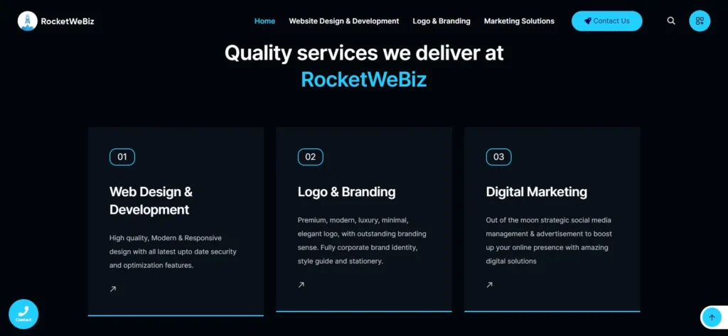 Rocket Webiz, a powerhouse in marketing solutions, branding, and web design, prides itself on delivering cutting-edge services to propel businesses forward. They approached the project with a clear vision: a modern, sleek, and dark design that captivates visitors and communicates sophistication. Their core offerings include marketing solutions, logo and branding services, and web design and development. As their senior project director, I collaborated closely with Rocket Webiz to outline their brand guidelines, establish key milestones, and ensure alignment with their strategic objectives.